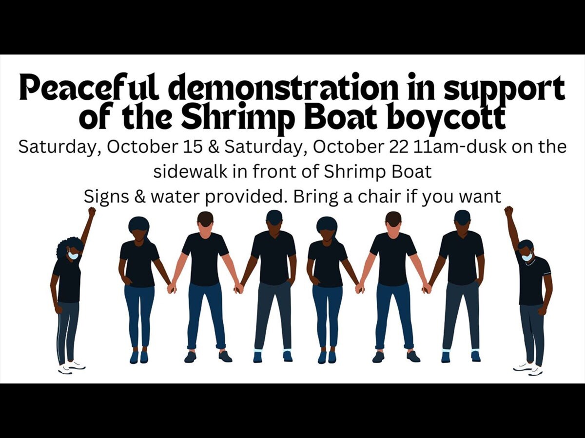 Reads the press release: "Community members are also invited to join the picket line on Saturday, October 15 from 11am until dusk on the sidewalk in front of Shrimp Boat. The group will meet up at Grateful Carwash on Underwood Road at 11am to get signs."