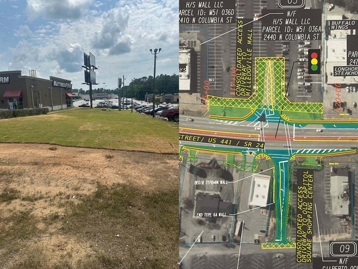 All the while, however, the Georgia Department of Transportation maintained that it was a "temporary" solution. Then, last month, the Milledgeville City Council got a look at the "permanent" solution, or at least the initial concept. That concept calls for the creation of a new stretch of road carved out of the Big Lots Shopping Center. The road would hug the El Amigo property on one side and the Mattress Firm property on the other. There's currently a large Hampton Inn sign and a very large billboard in the path, and it's not immediately clear how the DOT will attack that problem.