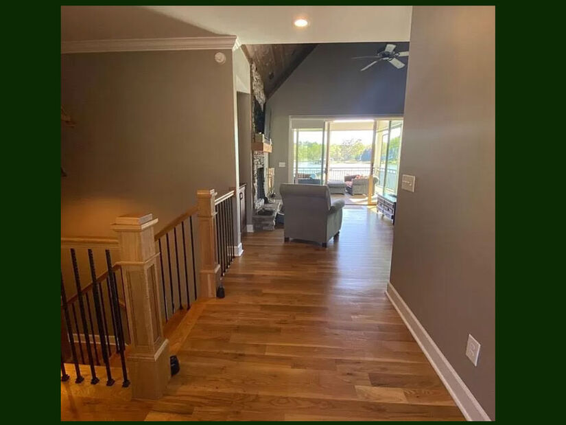 • wood accent wall leading to terrace level that opens up into billiard room (more wood accent walls)