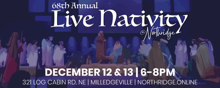 "Northridge Christian Church proudly offers the 68th annual Live Nativity event as a gift to our community. Relive the birth of Jesus on December 12th and December 13th from 6pm-8pm. This special event has narrative music, special lighting, and costumes reflecting the true meaning of Christmas. The public is invited to view the nativity by parking at the church and entering the building, which will also be open for prayer, refreshments, and activities for families. Northridge Christian Church is located at 321 Log Cabin Road in Milledgeville. Questions? Contact 478-452-1125 or online at northridge.online."