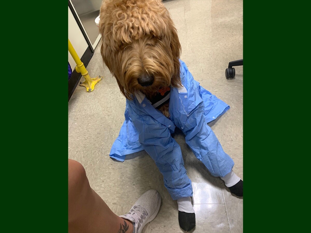 “I’m a science-based major so I’m in Herty Hall a lot; in labs and things like that, which traditionally is not a great space to have a dog or an animal on the floor,” she said. “So, he ended up wearing booties and a lab coat and laying on a mat on the floor to keep him as protected as we were.”